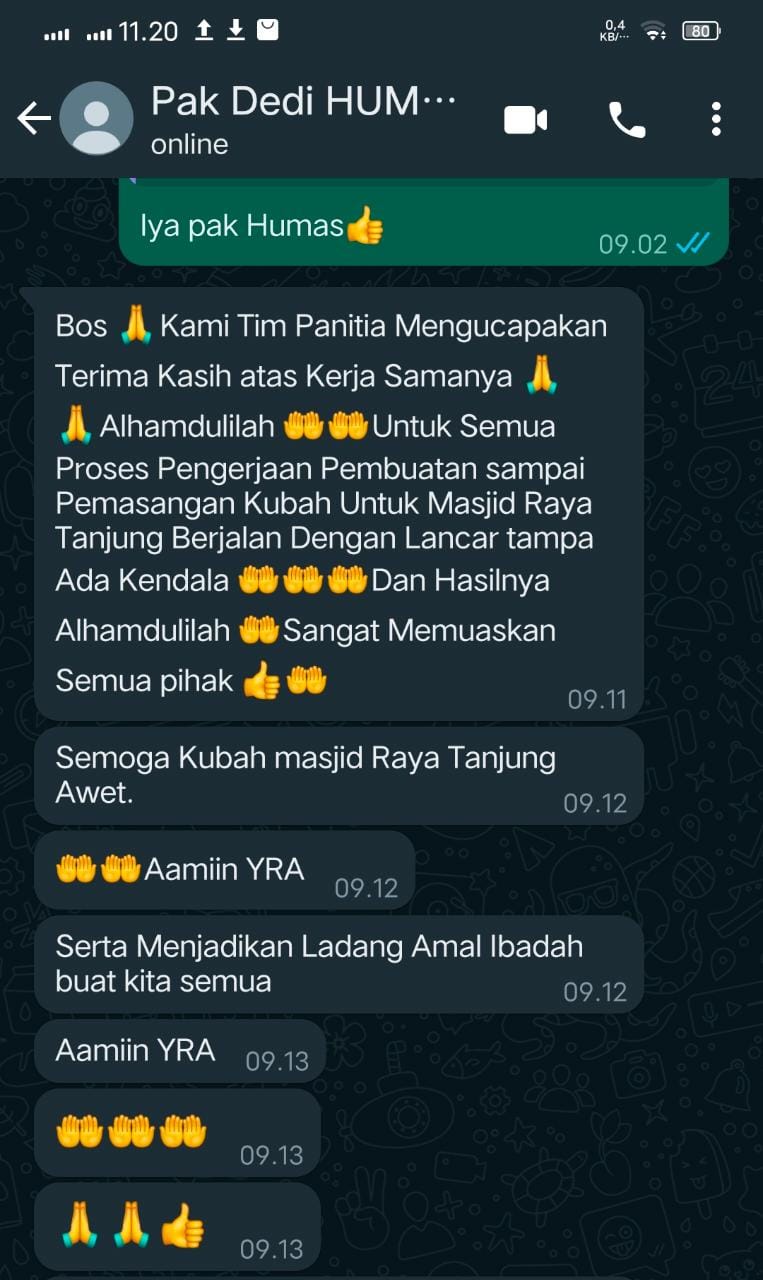 adminBos, kami tim Panitia Mengucapkan terimakasih atas kerjasamanya. Alhamdulillah untuk semua proses pengerjaan pembuatan kubah Masjid Raya Tanjung berjalan dengan lancar tanpa ada kendala dan hasilnya Alhamdulillah sangat memuaskan semua pihak. Semoga Kubah Masjid Raya Tanjung awet serta menjadi ladang amal buat kita semua. aamiin YRA.